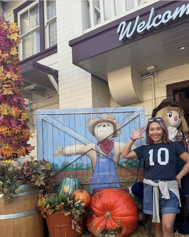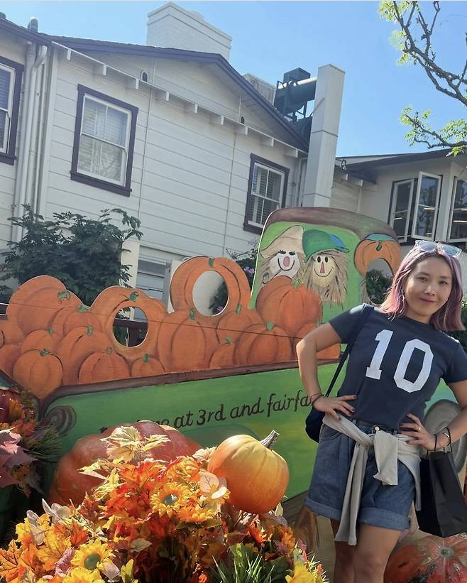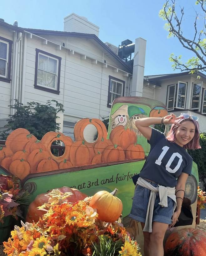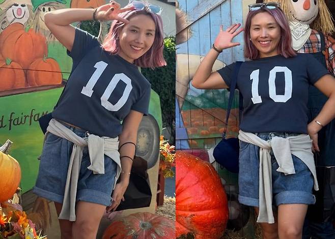 신봉선은 숫자 ‘10’이 새겨진 네이비 티셔츠와 롤업한 데님 숏팬츠를 매치해 힙한 분위기를 연출했습니다.