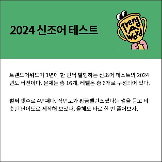 엄선하고 또 엄선해서 2024 트렌드어워드 신조어 테스트를 제작했습니다.