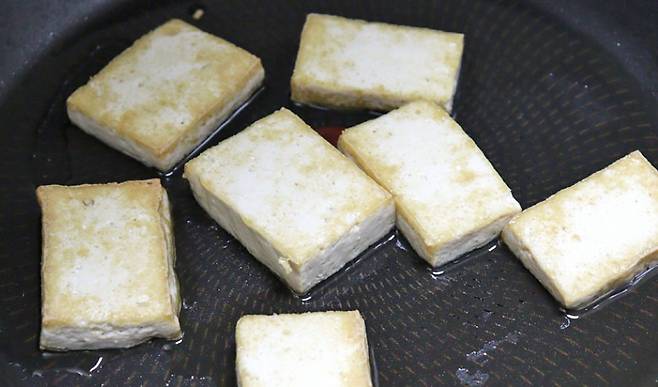 4. 프라이팬에 기름을 살짝 두르고 약불에서 두부를 앞뒤로 노릇하게 구워줍니다.