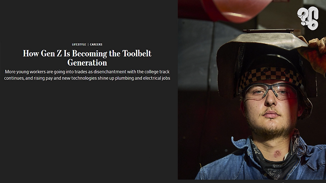 이 사진을 보라. 해외 기산데 미국의 2030세대들이 ‘배관공’이나 ‘용접공’ 같은 기술직으로 대거 몰리고 있다는 내용이다. 최근 한국에서도 ‘킹산직’ 채용에 엄청난 사람들이 몰리고, SNS에도 젊은 목수, 도장, 용접 전문가들의 게시물들이 많이 올라오고 있다. 유튜브 댓글로 “요즘 기술직이 2030들에게 인기가 많다고 하는데 실제 일은 어떤지 궁금하다”는 의뢰가 들어와 현직에서 일하는 2030 목수들을 취재했다.