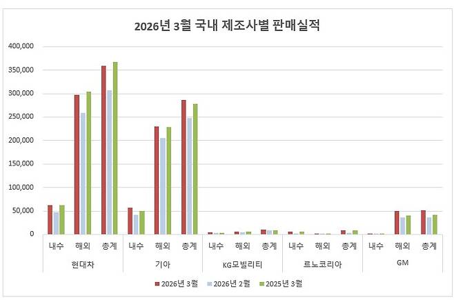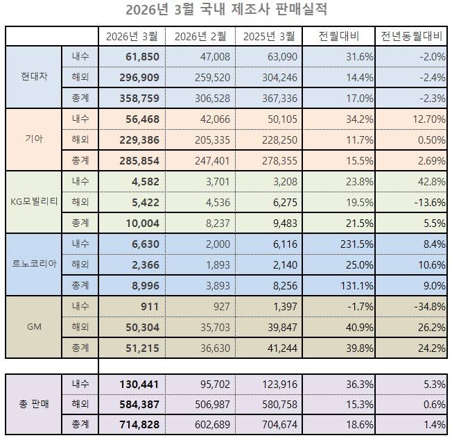 2026년 3월 국내 완성차 5사의 총 판매량은 내수 13만 177대, 해외 58만 4,501대 등 합산 71만 4,828대를 기록했다. 기아가 국내 12.8% 성장으로 분위기를 이끈 가운데, 르노코리아는 필랑트 출시 효과로 내수 시장에 강하게 복귀했다. KGM은 무쏘 판매 호조에 힘입어 6개월 만에 월 1만 대 벽을 다시 넘었다.