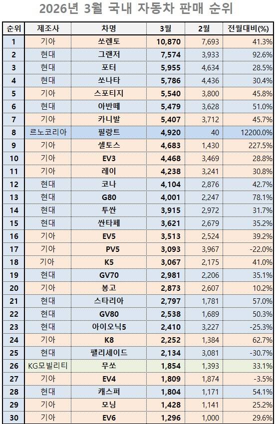 3월 내수 시장은 설 연휴 기저효과가 걷히며 전월 대비 전반적인 회복세를 보였다. 쏘렌토의 1만 대 돌파, 필랑트의 전격 등장, 무쏘의 픽업 시장 장악 등 굵직한 변수들이 순위표를 뒤흔들었다. 특히 기아의 EV3·EV5·PV5 등 전동화 라인업이 상위 20위권에 안착하며 전기차 시장의 주력 모델 세대교체가 본격화하고 있음을 보여줬다.