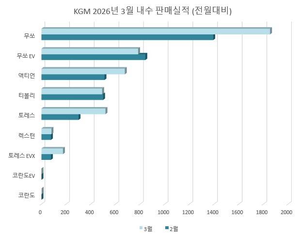 내수 성장의 핵심 동력은 무쏘였다. 1월 출시된 무쏘는 이달 1,854대를 기록해 전월(1,393대) 대비 30% 이상 증가했으며, 3월 초 기준 누적 계약 5,000대를 돌파하고 국내 픽업 시장 점유율 80% 이상을 차지하고 있다. 내수는 전년 동월 대비 42.8%, 누계로도 40.1%의 높은 증가율을 보이며 브랜드 회복세를 뚜렷하게 입증했다. 수출은 튀르키예 향 토레스 EVX 물량 증가에 힘입어 전월 대비 19.5% 늘었다.
