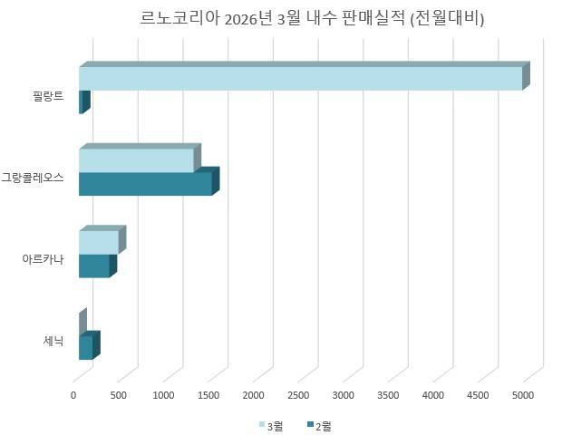 르노코리아는 3월 내수 6,630대, 수출 2,366대로 총 8,996대를 판매해 전년 대비 9% 증가했다. 지난달 전체 실적이 3,893대에 불과했던 것과 비교하면 두 배 이상의 급반등으로, 필랑트 출시가 결정적 역할을 했다.