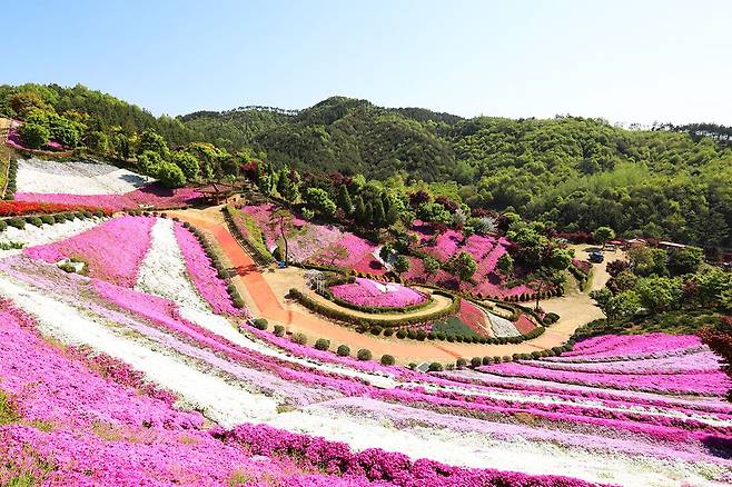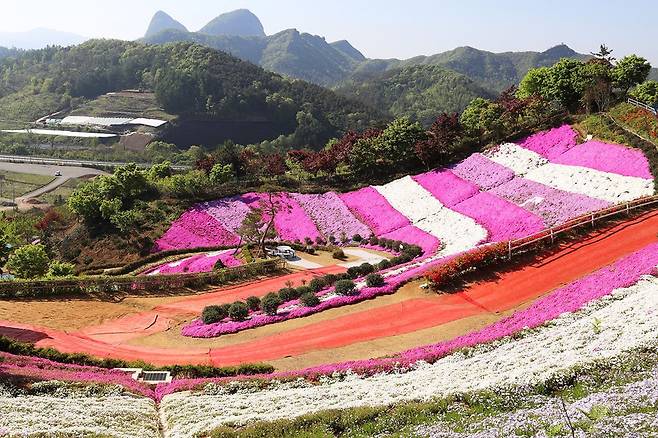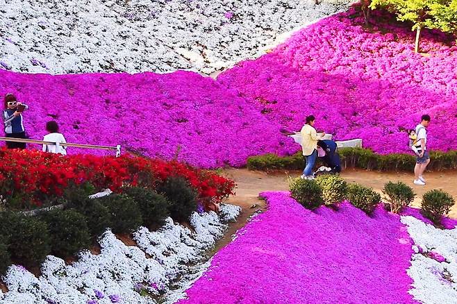 무려 축구장 24개 크기에 달하는 이 거대한 동산은, 분홍빛 꽃잔디가 마치 양탄자처럼 펼쳐져 방문객들의 시선을 단숨에 사로잡는다.
