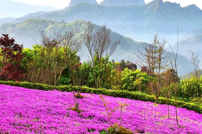 수천만 송이의 분홍, 보라, 흰색 꽃잔디가 파도처럼 물결치며 시야를 가득 채운다.