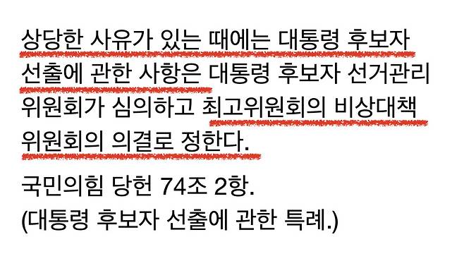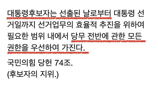 국민의힘 당헌 74조에는 “대통령 후보자는 선출된 날로부터 당무 전반에 관한 우선권을 갖는다”고 규정하고 있다. 다만 74조 2항은 “상당한 사유가 있는 경우 후보자 선출에 관한 사항은 후보자 선관위가 심의하고 최고위원회의 의결로 정한다”고 돼 있다.