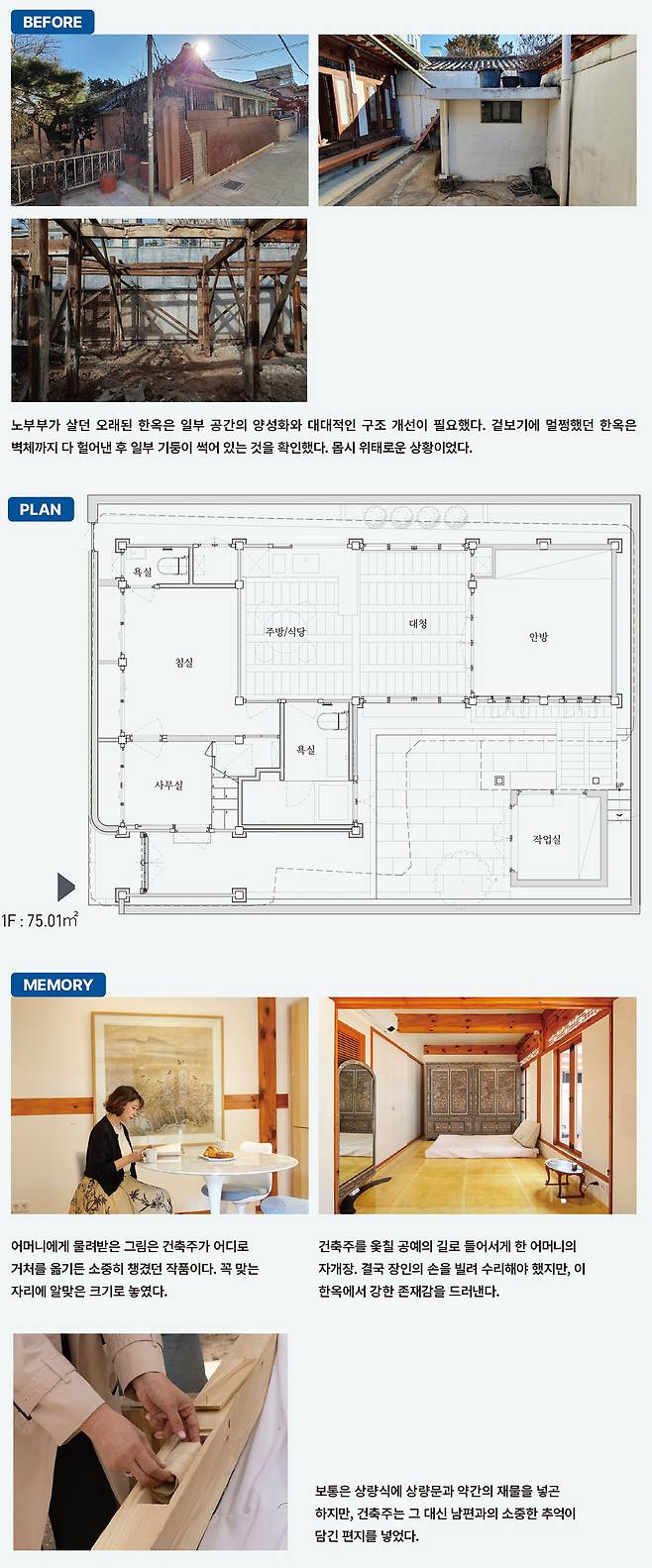 건축주는 한옥을 한옥답게 고치길 바랐다. 근래 유행하는 많은 한옥 스테이가 특별한 인상을 남기기 위해 주는 이국적인 변주보다는, 오랜 시간이 지나도 한국적 정서와 가치를 잃지 않는 집을 원했다. 건축가의 설계는 기존 한옥이 가진 겹집 구조나 진입로와 마당의 관계 등 흐름과 구성을 흐 트러뜨리지 않는 데에 초점을 맞춰졌다.