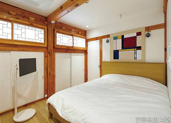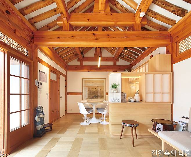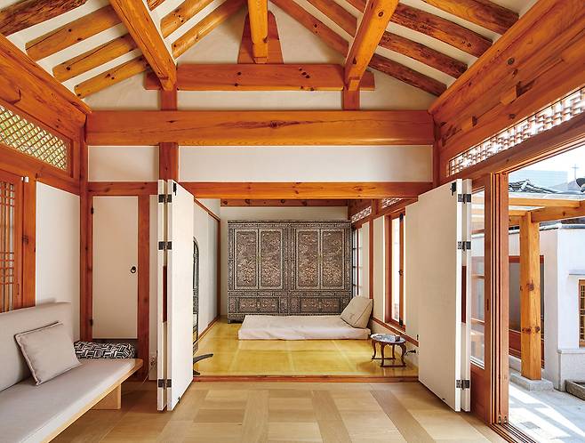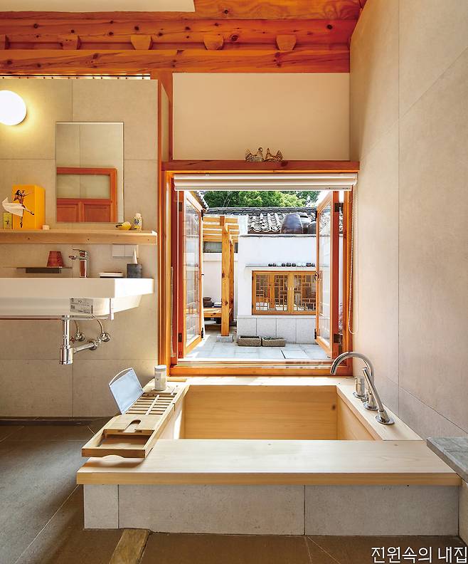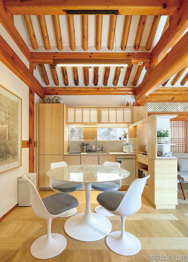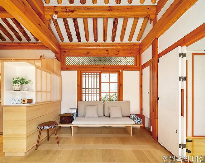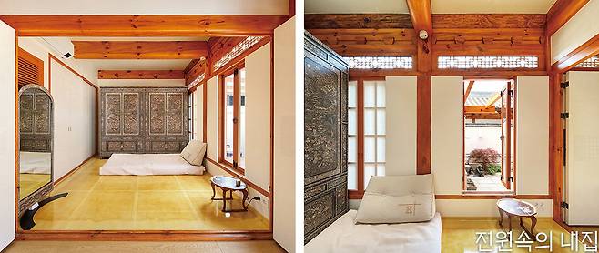 대문을 지나 마당으로 들어서면 ‘ㄱ자’ 형태의 안채와 과거에 물치(장독대가 있는 건물)였던 작업실을 만날 수 있다. 무허가 건축물이었던 물치는 철거 후 작업실로 다시 지어졌고, 안채와 작업실 사이는 마루와 한식 구조 틀, 그 위로 유리 지붕이 놓여 소통에 불편함을 줄였다. 안채에 들어서면 주방과 공간을 공 유하는 대청을 중심으로 오른편으로는 안방이 놓였다. 주방과 대청의 분리, 방의 성격 구분은 건축가가 가장 신경 썼던 부분 중 하나였다. 그리고 시선과 분위기가 충돌하지 않고, 가구는 기능을 담되 한옥의 정서를 해치지 않도록 조심스럽게 조율했다. 옛 한옥에서 부엌이었던 공간은 욕실이 되어 마당을 사이에 두고 작업실을 마주 보는 형태가 되었다. 주방의 한쪽 문을 열고 들어서면 작은 화장실이 딸린 또 다른 침실을 만날 수 있다.