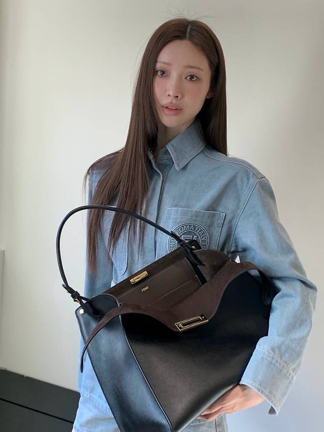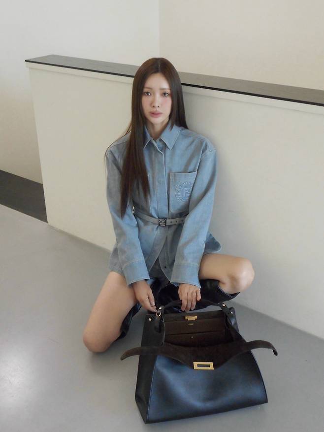 무릎까지 올라오는 루즈한 핏의 블랙 레더 부츠를 매치해 가녀린 다리 라인을 더욱 돋보이게 만들었으며, 넉넉한 사이즈의 블랙 피카부 백을 곁들여 전체적인 룩에 안정감과 고급스러움을 더했는데요.