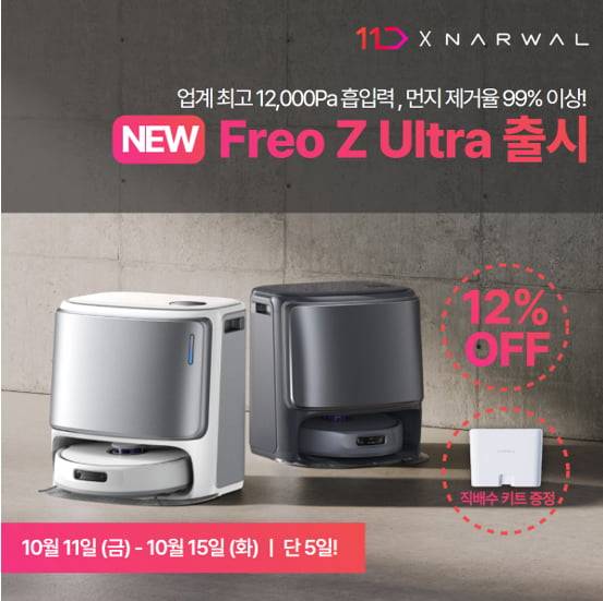 로봇청소기 브랜드 나르왈이 11번가 십일절 이벤트를 통해 신제품 '프레오 Z 울트라' 2차 런칭 프로모션을 진행한다고 밝혔다.