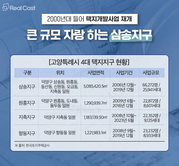 1990년대 말을 끝으로 주춤했던 고양특례시 택지개발사업은 일산신도시(일산동구, 일산서구)를 중심의 도시기능을 분담시키기 위해 2000년내 들어서 다시 추진됐습니다. 이렇게 해서 등장한 곳들이 고양특례시 4대 택지지구인 삼송지구, 원흥지구, 지축지구, 향동지구 등입니다.