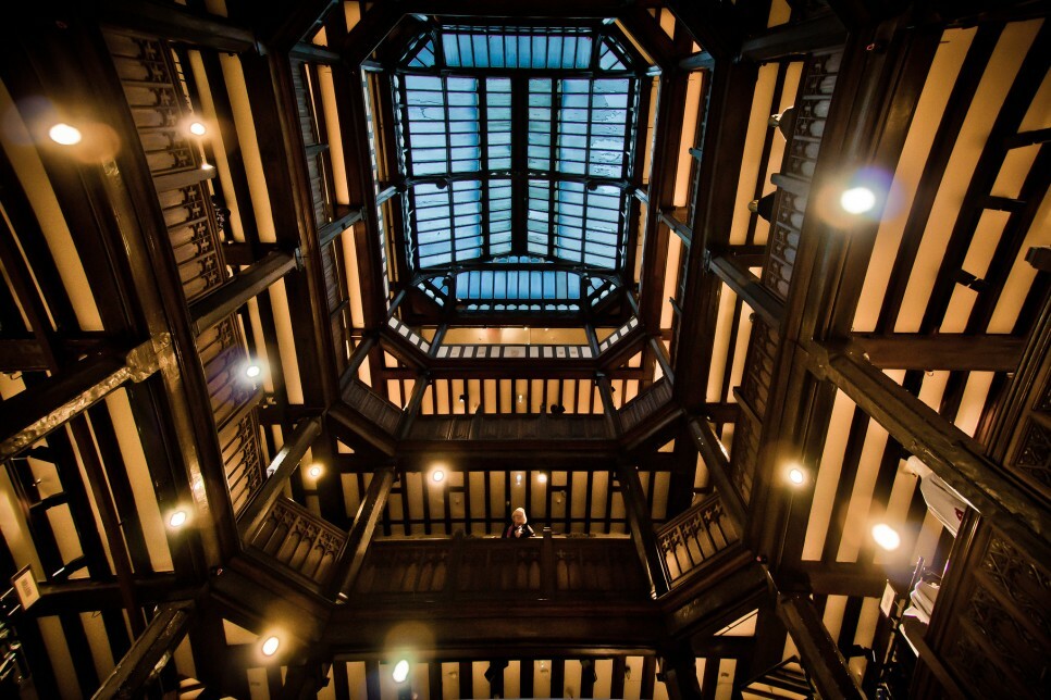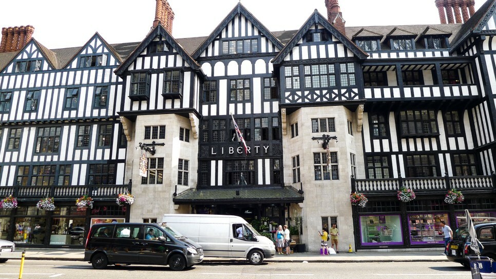 하얀 벽과 목재가 뒤섞인 아름다운 건물은 튜더 양식(Tudor Style)에 기초한 것이다. 튜더 양식은 영국의 튜더 왕조의 이름에서 기인했으며 헨리 7세와 헨리 8세가 다스리던 16세기 전기에 유행하던 영국의 건축 양식으로 수직적인 직선미를 특징으로 한다. 리버티의 건물은 배 두 척을 해체해 만든 것이라고 한다. 마치 고택을 연상시키는 매력적인 건물은 영화 ‘크루엘라’에 나오기도 했다.