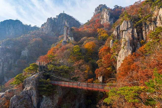 대둔산은 수려한 암봉들이 금강산을 닮았다 하여 호남의 금강이라 불리는 명산입니다. 이곳 대둔산의 절경을 가장 가까이, 그리고 가장 스릴 있게 경험할 수 있는 곳이 바로 금강구름다리인데요.