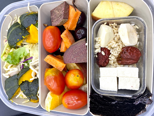 - 굽지 않은 김 한 장, 당근, 비트 등 각종 채소와 과일