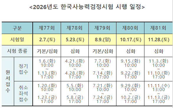 미루다 보면 접수 전쟁입니다.한능검은 빨리 따둘수록 무조건 유리합니다.