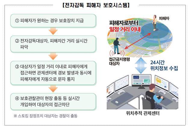 앞서 법무부는 스토킹 범죄자 등 전자감독 대상자가 일정 거리 안으로 접근할 경우 피해자에게 휴대전화 문자로 가해자 위치정보를 자동 전송하는 기능을 적용해 피해자 보호시스템을 강화했다.