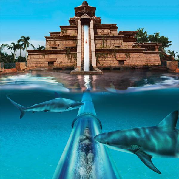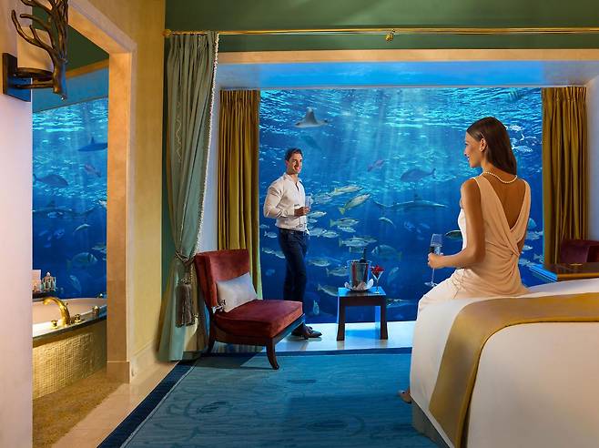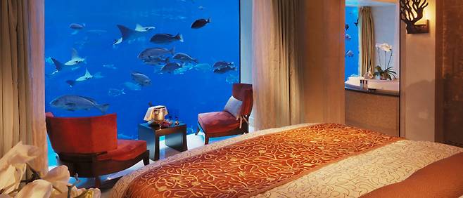아틀란티스 더 팜은 두바이의 인공섬 팜 주메이라에 세워진 첫 번째 리조트인데요. 총 23층의 높이에 1,539개의 객실이 있습니다. 그중에서도 언더워터 스위트룸은 바닷속 로망을 그대로 현실화 시킨 객실인데요. 천장부터 바닥까지 이어진 창 너머로 바다 파노라마를 감상하다 보면 인어공주가 된 듯한 착각에 빠질지도 모르겠습니다. 거실에서도 침실에서도 심지어 욕실에서도 바닷속을 볼 수 있으니 물고기들과 금방 친해지겠네요. 호텔 숙박 시에 워터파크 이용 또한 무료인데요. 특히 세계에서 가장 무서운 워터슬라이드라는 상어 수조 워터 슬라이드는 노약자에게는 비추천입니다.