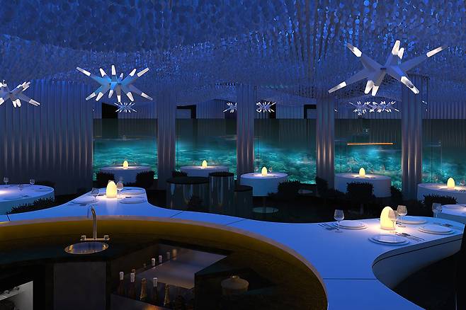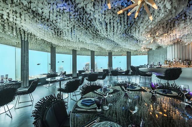인도양 중심부 랑갈리 섬에 위치한 콘래드 리조트에는 12개의 레스토랑이 있는데요. 그중에서도 '이타아'는 세계 최초의 해저 레스토랑으로 유명합니다. 이타아는 실제로 수중 5m 지점에 위치해 돔 형태의 유리를 통해 바닷속을 만끽할 수 있는데요. 13cm 두께의 전면 아크릴 유리로 만들어진 창문 너머로는 거북이, 가오리, 상어 등 23여 가지 종류의 해양 생물들을 만날 수 있습니다. 단 테이블이 적으니 예약은 필수라고 하네요.