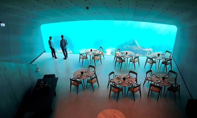 최근 노르웨이 남부 도시 린데스네스에 유럽 최초의 수중 레스토랑이 문을 열어 화제가 되었는데요. '언더'라는 이름의 이 레스토랑은 북대서양의 거친 수압에 견딜 수 있는 3층 규모의 길고 두툼한 2500t 짜리 강화 콘크리트로 만들어졌습니다. 지상에 위치한 입구에서 계단을 따라 수중 5m까지 내려가면 길이 11m, 높이 4m의 창을 통해 바다 풍경을 즐길 수 있는데요. 이달 초부터 본격 영업을 시작해 문을 연지 한 달도 채 안 되었지만 이미 7000명 이상 예약이 될 만큼 인기가 많다고 합니다.