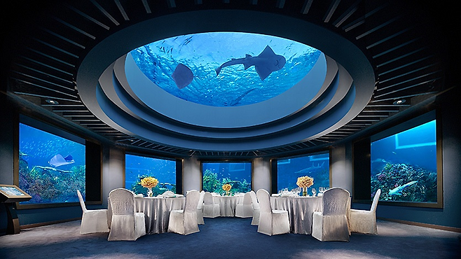 인도양 중심부 랑갈리 섬에 위치한 콘래드 리조트에는 12개의 레스토랑이 있는데요. 그중에서도 '이타아'는 세계 최초의 해저 레스토랑으로 유명합니다. 이타아는 실제로 수중 5m 지점에 위치해 돔 형태의 유리를 통해 바닷속을 만끽할 수 있는데요. 13cm 두께의 전면 아크릴 유리로 만들어진 창문 너머로는 거북이, 가오리, 상어 등 23여 가지 종류의 해양 생물들을 만날 수 있습니다. 단 테이블이 적으니 예약은 필수라고 하네요.
