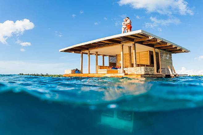 탄자니아 펨바 섬에 있는 만타 리조트에는 언더워터 룸이 있는데요. 바다 한가운데 덩그러니 세워진 이 호텔은 수중에 위치한 객실과 바다 위의 1층 그리고 옥상 이렇게 3개 층으로 이루어져 있습니다. 옥상에서는 태닝을 하며 프라이빗한 여유를 즐길 수 있는데요. 무엇보다도 언더워터 룸의 하이라이트는 지하 객실이지요. 수심 4m에 위치한 이 객실에서는 360도로 바닷속 경치를 볼 수 있는데요. 인공 아쿠아리움이 아닌 실제 바닷속이라는 사실이 더욱 감동을 자아냅니다.