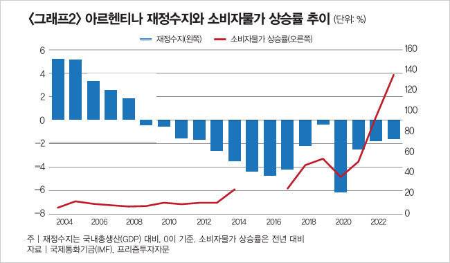 아르헨티나 역대 정부의 최대 실책은 만성적인 재정수지 적자였다. 페론주의(국가사회주의 이데올레기로 외국 자본 배제, 산업 국유화, 복지 확대, 임금 인상을 통한 노동자 수입 증대 추구) 정당은 국민에게 다양한 방법으로 보상을 약속하고, 보상으로 지급할 돈이 없을 때는 지체 없이 중앙은행에서 돈을 찍어냈다.