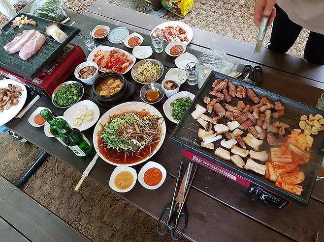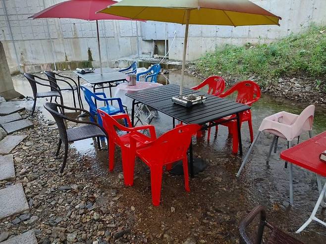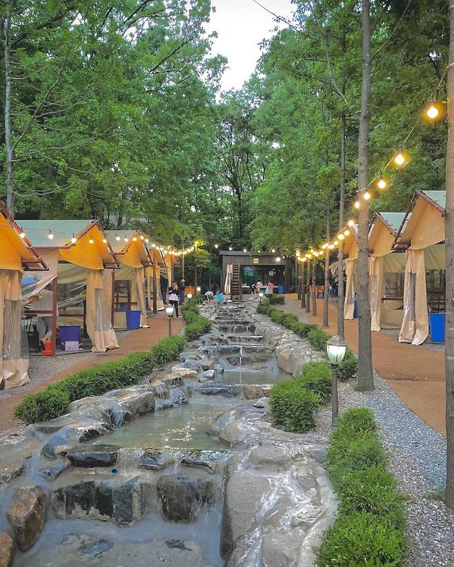 '정원'이라는 말이 딱 어울리는 그림 같은 풍경의 청주 '묵방골정원'. 인공 계곡 옆으로 줄지어있는 텐트 중 선착순으로 마음에 드는 자리에 골라 앉으면 된다고. 본관으로 들어가 고기와 주류, 음료와 각종 사이드 음식을 주문하고 각종 식기들을 챙겨오면 준비 완료. 인공 계곡이기 때문에 물살이 세지 않아서 아이들이 놀기에도 안성맞춤이다. 밤에 불이 켜지면 분위기가 또 달라진다니 밤을 즐겨보는 것도 추천한다.