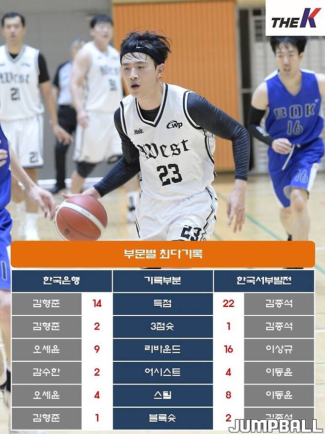 한국서부발전은 17일 서울 관악구 인근 체육관에서 열린 2023 The K직장인농구리그(www.kbasket.kr) 2차대회 디비전 2 B조 예선에서 김종석(22점 5리바운드 4스틸)을 필두로 이상규(14점 16리바운드), 추광래(11점 13리바운드)가 골밑을 든든히 지켜낸 데 힘입어 한국은행을 60-29로 꺾고 3연승을 내달렸다.