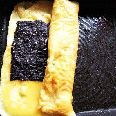 김이 계란 위에 잘 붙도록 살짝 눌러주면, 말 때 들뜨지 않는다. 김이 너무 두꺼우면 말 때 안에서 터지기 쉬우니, 김을 두 겹 이상 겹치지 않는 게 좋다. 첫 번째 말 때만 조심하면, 이후엔 자연스럽게 이어서 부어주고 돌돌 말아주기만 하면 된다. 들기름이 익어가며 퍼지는 향이 주방 전체를 감싸면서 입맛을 자극하기 시작할 것이다.