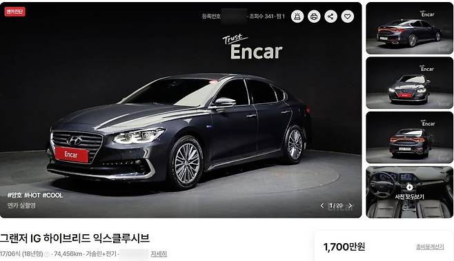 2025년 8월 19일 기준 중고차 플랫폼 엔카닷컴에 등록된 그랜저 전체 매물은 무려 1만 176대로, 전체 국산차 중고 매물의 8.5%를 차지하고 있다. 이 중에서도 2017-2019년식 그랜저 IG 하이브리드는 424대가 거래되고 있으며, 최저가 750만원이라는 충격적인 가격표를 달고 있다.