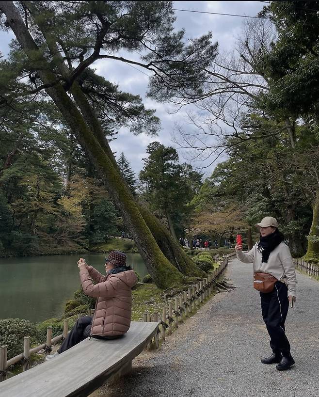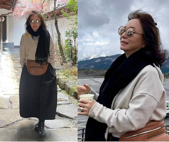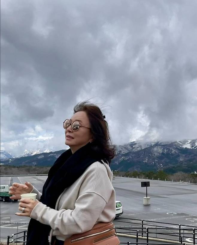 특히 김미숙은 배경으로 펼쳐진 눈 덮인 산과 맑은 하늘 아래에서 한 손에 커피 컵을 들고 환하게 미소 짓는 모습은 마치 한 폭의 그림 같은 단연 돋보이는 존재감을 발휘했습니다.
