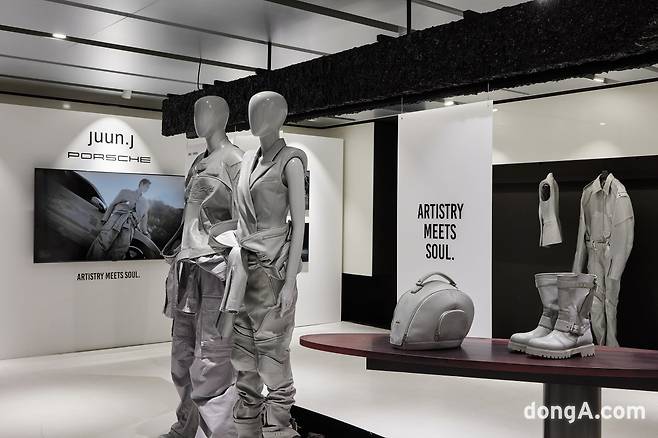 19일까지 준지 플래그십스토어서 공개 포르쉐 스포츠카 75주년 프로젝트 일환 한국 아티스트 협업 ‘드림 인 풀 컬러’ 전개 포르쉐 전기차 타이칸 크레용 컬러서 영감 바이커·재킷·헬멧 백·라이딩슈즈 등 6종 전시