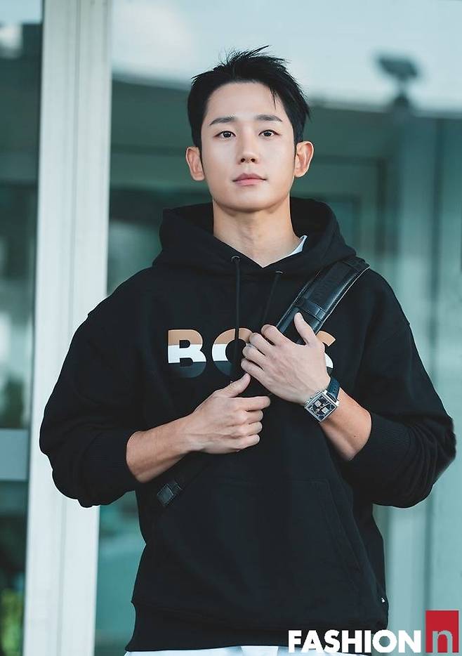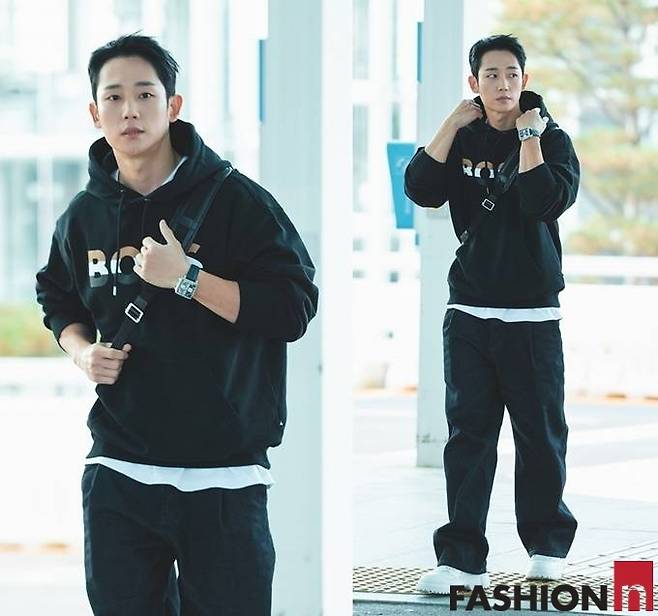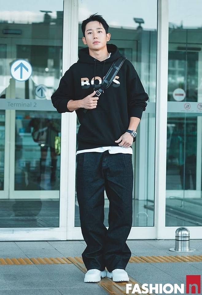 배우 정해인이 후드 셔츠에 크로스백으로 힙한 공항룩을 연출했다.