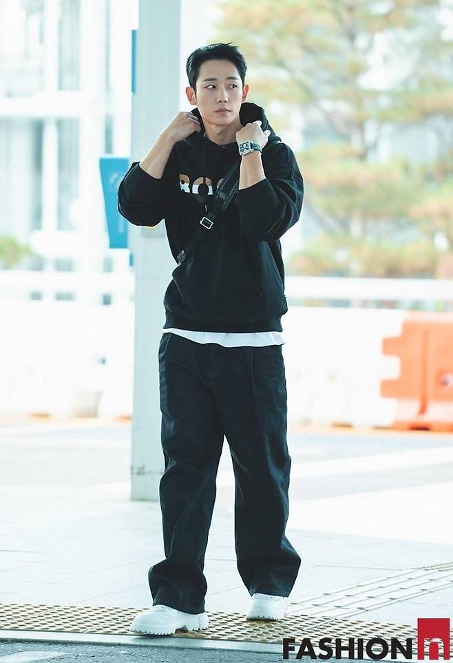 이날 정해인은 와이드 데님 팬츠와 블랙 후드 스웨셔츠에 크로스백을 매치한 단촐하면서도 힙한 공항룩을 선보였다.