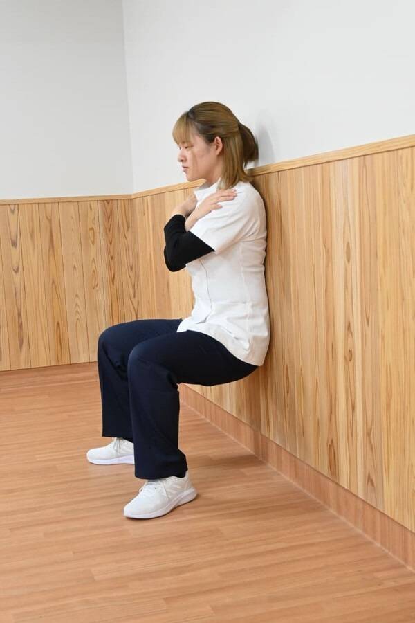 관절이 약하거나 무릎 통증이 걱정된다면 벽을 등지고 하는 ‘벽 스쿼트’부터 시작해보세요.