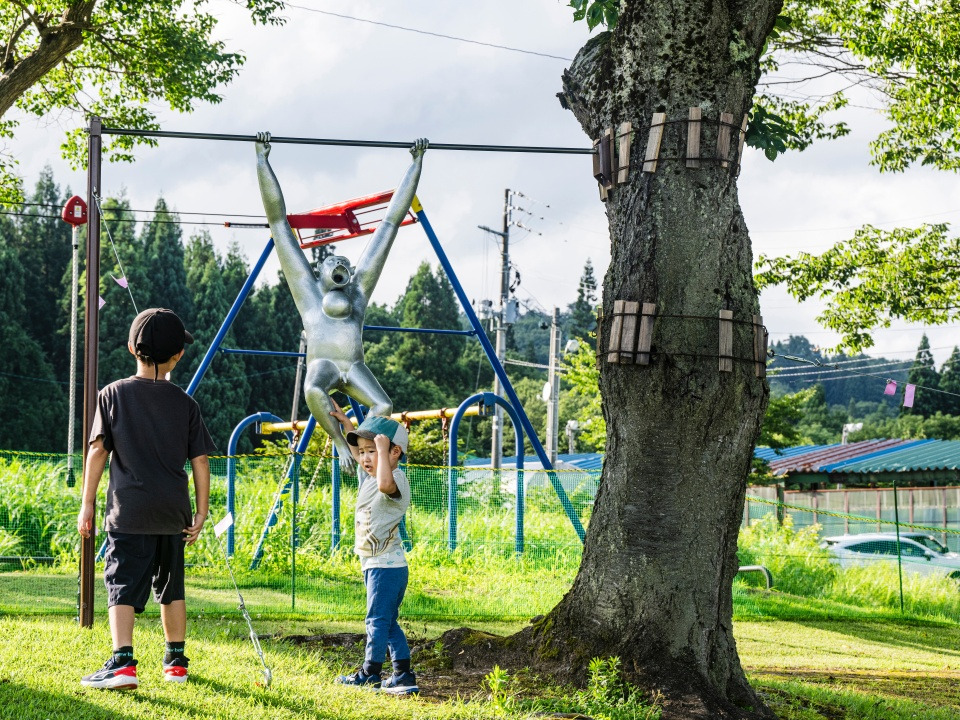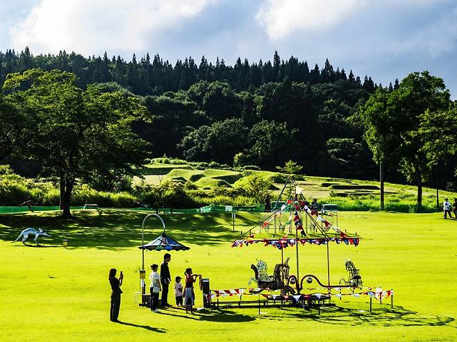 에치고쓰마리 사토야마 현대미술관에서 차를 타고 북쪽으로 10분 남짓 달리면 주변 산자락에 둘러싸인 채 골프와 캠핑 등을 즐길 수 있는 나카고 그린 파크(ナカゴグリーンパーク)에 이른다. 부지 내 1.3헥타르 면적의 너른 잔디 광장은 대지예술제의 주 무대 중 하나. 자연과 예술, 놀이가 어우러져 아이들과 함께 즐길 수 있는 전시를 선보이는데, 올해의 테마는 동물원. 검정이 섞인 노란색 로프로 표현한 호랑이, 실물 크기의 기린, 철봉에 매달린 원숭이 등 유머러스한 작품이 탁 트인 야외 공간에 펼쳐져 있다.