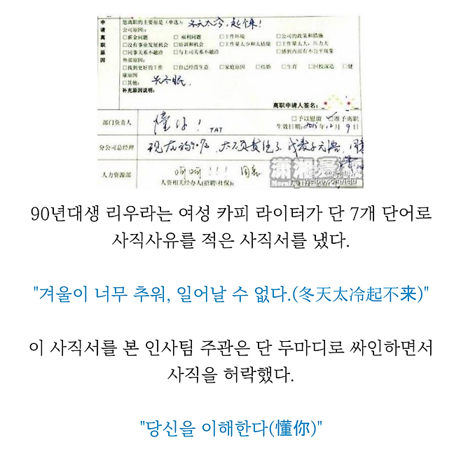 “겨울이 너무 추워, 일어날 수 없다.” 이 한 줄짜리 사직서에 수많은 직장인들이 웃으면서도 울컥했다. 사직서를 받아든 상사는 단 두 마디로 허락했다. “당신을 이해한다.” 말이 짧을수록 진심은 깊게 와닿는다.