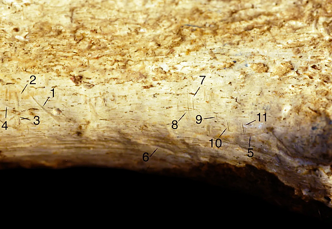 포비너는 "치과에서 치아를 본뜰 때 사용하는 재료로 정강이뼈 틀을 조심스럽게 떴다"며 "이를 미국 콜로라도주립대학교와 퍼듀대학교 고인류학 전문가들에 보내 최소 9개 상처가 석기로 새겨졌다는 답변을 받았다"고 말했다.