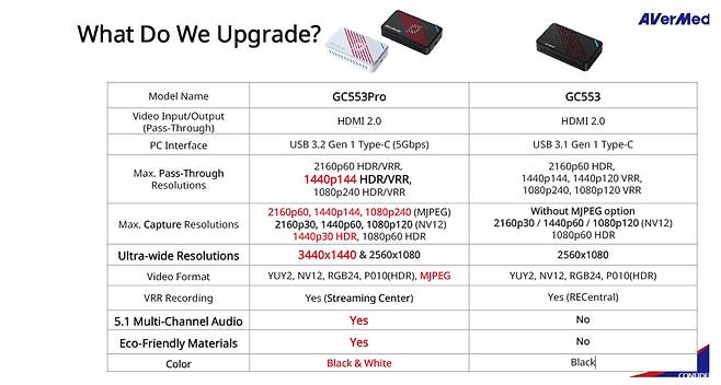 전반적으로 GC553Pro 제품이 캡쳐 가능한 해상도와 프레임이 늘어난 것이 가장 큰 특징입니다.