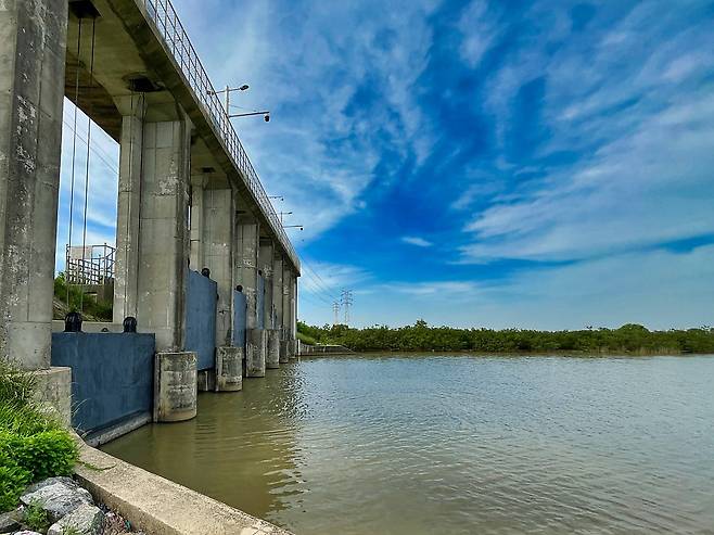수문 뒤편의 수로와 수문 앞 석축 등
