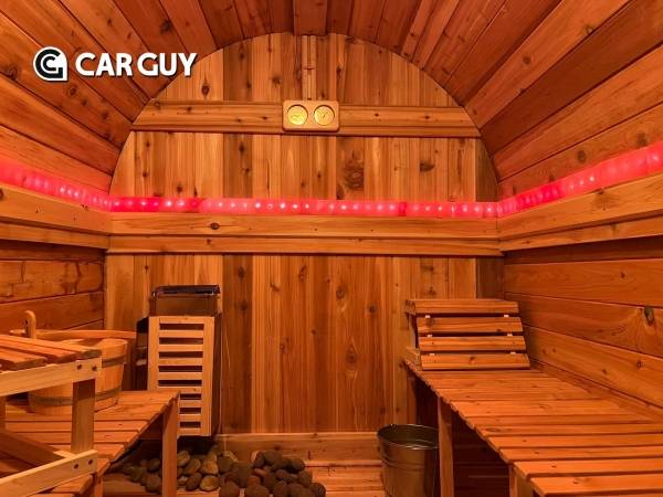 내부는 외관과 마찬가지로 삼나무로 제작해 성인 4~5명이 앉을 수 있다. 멀티컬러 조명에 둘러싸여 벽면에 부착된 히말라야 소금 블록은 신체의 pH 수준을 낮출 수 있는 웰빙을 제공한다. 사우나 특유의 은은한 감성도 더해준다. 벤드는 사우나를 가열하기 위해 전기 스토브와 장작난로 두 가지 옵션을 마련했다. 이를 통해 사우나 온도를 38~93°C까지 끌어올릴 수 있다.