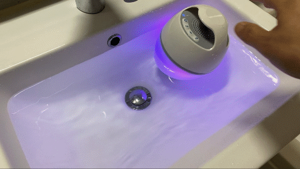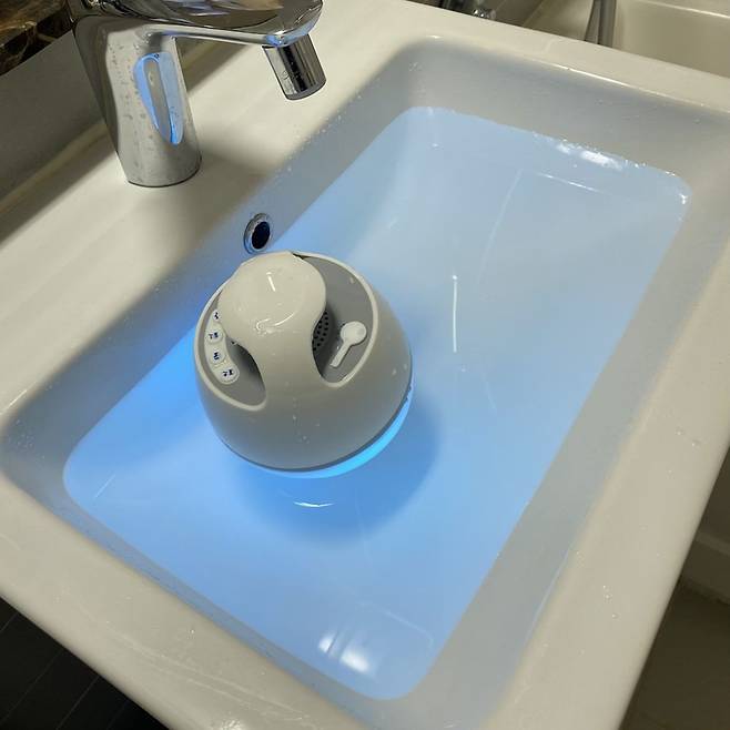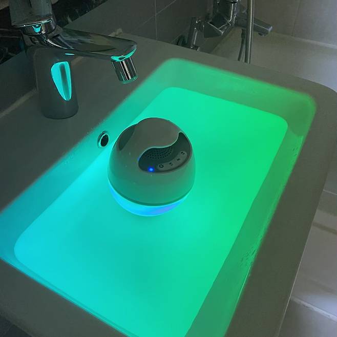 방수 스피커니 물에서 테스트를 해 봐야겠죠. 저는 아이가 없어서 물놀이 장면을 연출할 수 없었어요. 요즘 날씨에 풀장에 가기도 어려워서 세면대에 스피커를 넣어 봤습니다. 처음에는 좀 조심스러웠어요. 아무리 방수라고 해도 전기제품을 물 속에 넣는 다는 것이 일상적인 것은 아니잖아요. 혹시 고장나면 어쩌지 하면서 스피커를 물 속에 넣었는데 아주 방수가 잘 되네요. 물에 띄우기도 하고 완전히 물 속에 잠궈도 동작에는 문제가 없습니다. 아예 몇 시간 동안 물 속에 넣어 두었는데도 음악이 잘 나옵니다. 특히 조명을 낮추고 LED를 켜면 분위기가 더 멋집니다. 아마 이번 여름에 풀장에 간다면 밤에 사용하면 인싸가 될 것 같습니다.