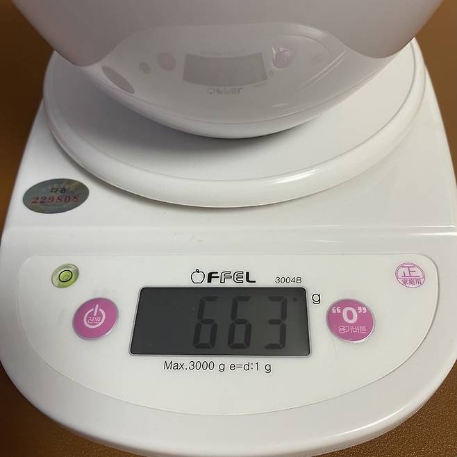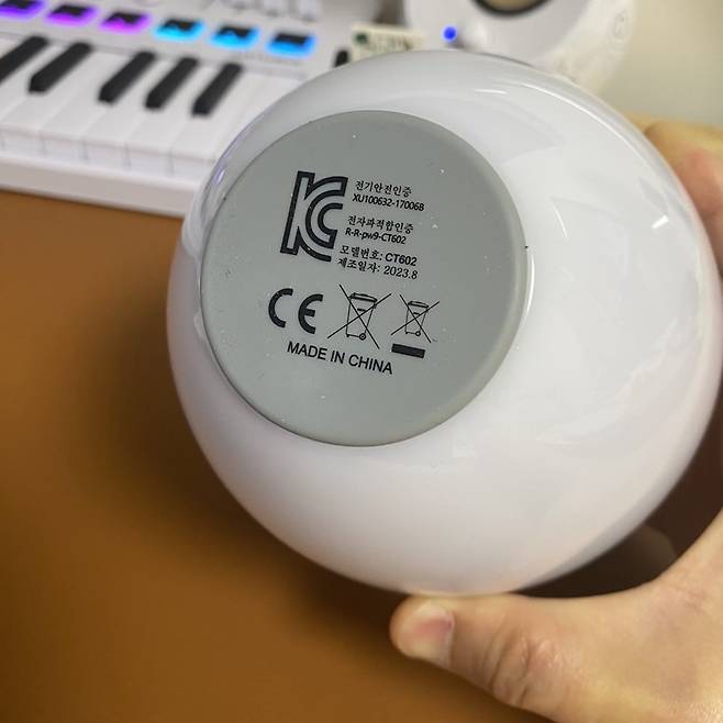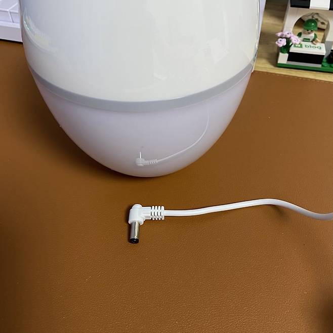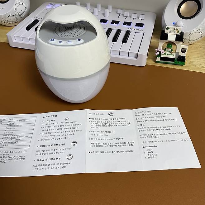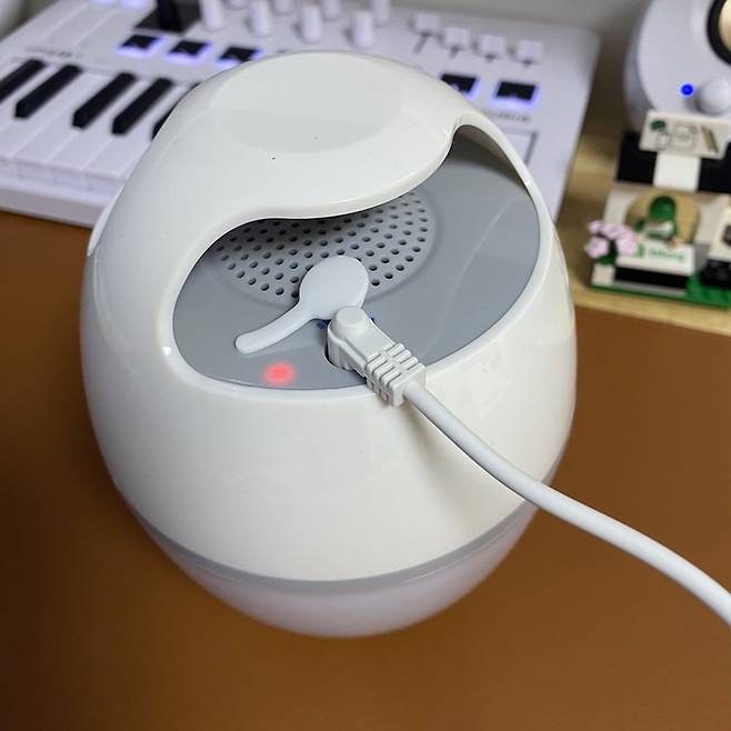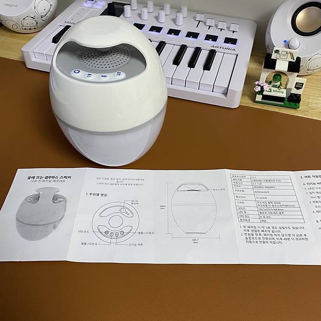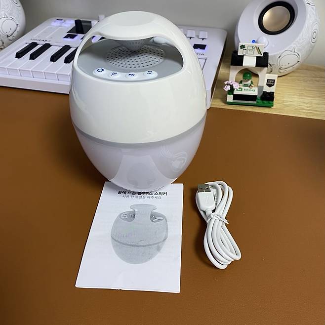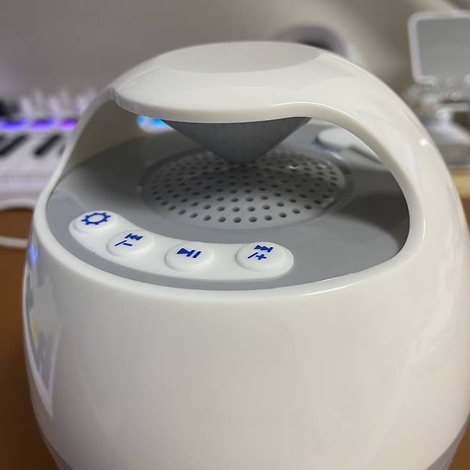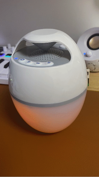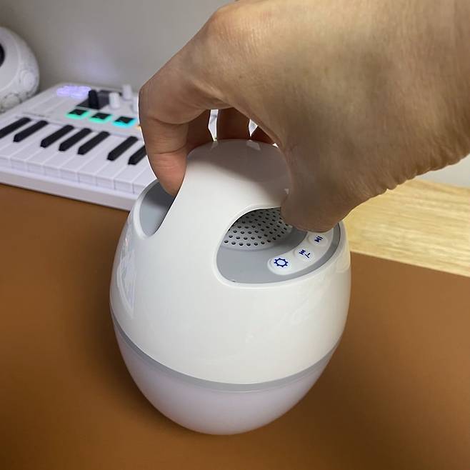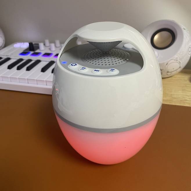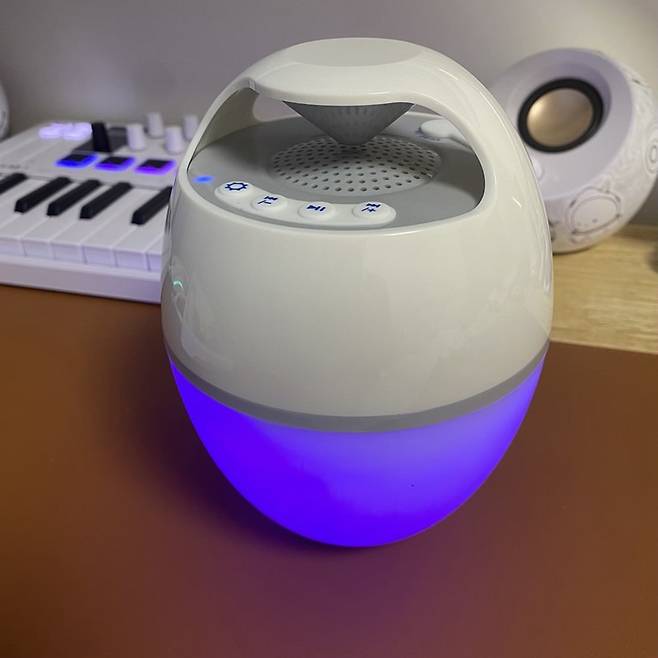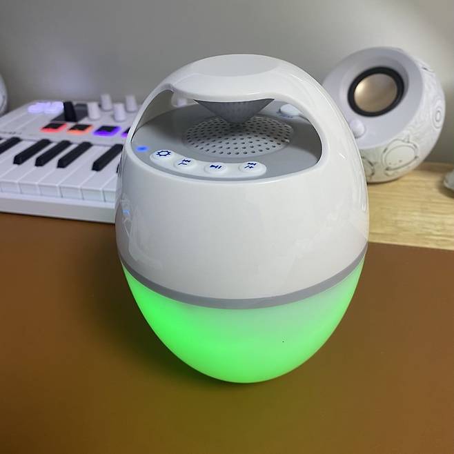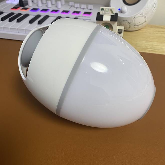 외관은 달걀처럼 미끈하게 생겼습니다. 제가 실제로 타조알을 본 적이 없어 비교할 수는 없지만 첫 인상은 타조알 같다는 생각을 했어요. 하단은 반투명처리되어 조명 기능이 있고, 상단은 화이트 유광 플라스틱 재질로 충전 단자와 조작 버튼, 스피커가 있습니다. 크기는 성인 남자가 손으로 잡으면 들 수 있는 수준입니다. 작은 파인애플 같아요. 무게는 660그램으로 크기 대비는 묵직합니다.