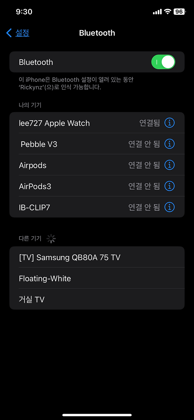 음원 기기와의 페어링은 여느 블루투스 스피커와 다르지 않습니다. 전원 버튼을 길게 눌러 페어링 모드로 들어가면 스마트폰에 제품 이름이 나옵니다. 설명서에도 첫 페어링이 오래 걸릴 수 있다고 하는데 정말 시간이 좀 걸렸습니다. 3분까지는 아니지만 빠른 페어링 기기에 비하면 좀 느리네요. 하지만 페어링이 한번 되면 이후에는 문제없이 잘 연결됩니다.