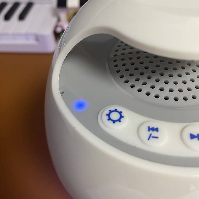 상단에는 4개의 버튼이 있습니다. 방수를 위해 플라스틱으로 빈틈이 없는 구조라서 누를 때의 감촉은 고급스럽지 않습니다. 약간 힘을 주어야 눌립니다. 버튼은 재생/정지와 전후 및 음량, 조명 조절을 할 수 있습니다. 조명 조절 버튼 옆에는 작은 LED가 있어서 현재 동작 상황을 알려줍니다.