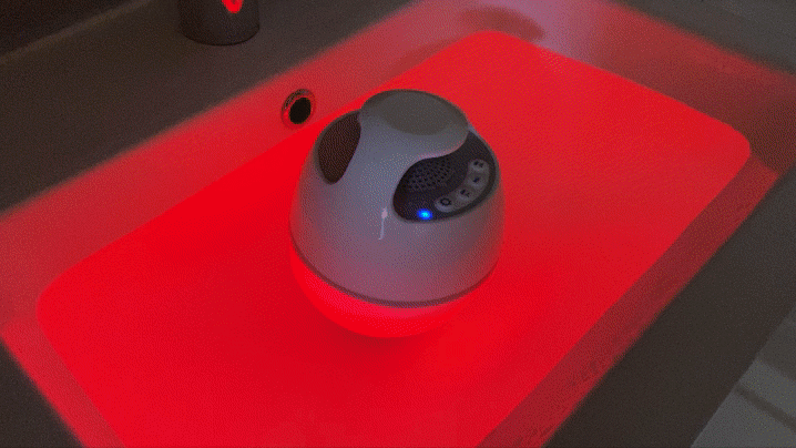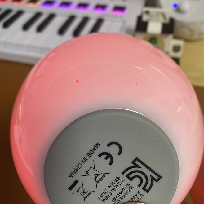 전원을 켜면 반구 아래의 불투명 플라스틱에서 불이 들어옵니다. RGB 라이트가 조합을 이루어 빛이 자연스럽게 그라데이션되기 때문에 저도 모르게 불멍을 하게 되네요. 조명 버튼을 누르면 한가지 색으로 고정할 수 있고 반짝반짝 색을 바꿀 수도 있습니다. 다만 조도는 조절이 되지 않네요. 아주 밝지 않아서 조명이 있는 욕실에서는 크게 눈부시지 않지만 어두운 환경에서는 조도를 낮추는 기능이 있으면 좋을 것 같습니다. 아래에서 자세히 보면 원형으로 LED 램프가 보입니다. 위에서 아래로 불을 내는 방식이라서 반구 전체가 하나의 컬러로 불을 밝히는 방식입니다. 만일 반구 전체에 램프를 넣어서 패턴이나 글자, 그림을 표현할 수 있다면 더 멋졌을 것 같아요.