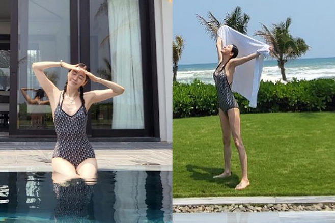 이다희는 명품 브랜드 로고가 박힌 네이비 컬러 수영복으로 세련된 스타일링을 선보였습니다.
