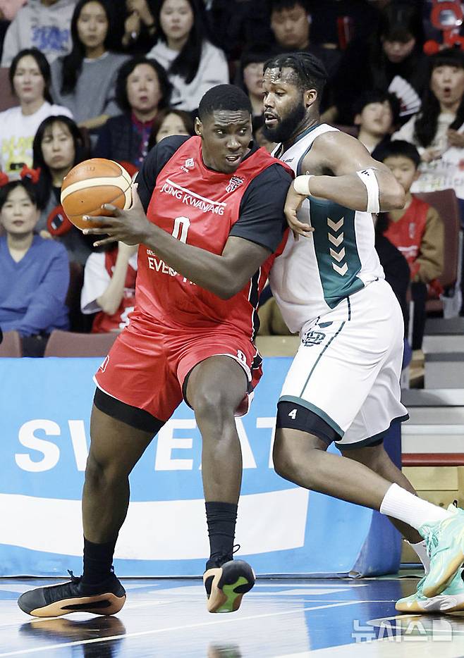 [안양=뉴시스] 최동준 기자 = 22일 경기 안양정관장아레나에서 열린 2024-2025 KBL 리그 원주 DB 프로미와 안양 정관장 레드부스터스의 경기, 정관장 조니 오브라이언트가 DB 로버트 카터의 수비를 피해 슛 기회를 노리고 있다. 2025.01.22. photocdj@newsis.com