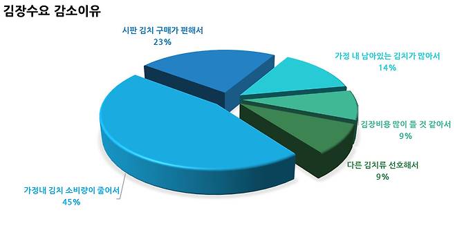 한국농촌경제연구원에서 조사한 결과, 한국인들의 김장 의향이 줄어든 가장 큰 원인은 바로 가정 내 김치 소비량 감소(45.6%)였다. 1인 가구가 증가하고 집밥 대신 외식을 하거나 배달 음식을 시켜 먹는 비중이 커지면서, 자연스럽게 김치 소비량이 줄어들고 있는 것이다. 다음으로는 필요할 때마다 조금씩 사 먹을 수 있는 시판 김치 구매가 편해서(23.1%), 아직 남아있는 김치가 있어서(13.6%) 등의 의견이 뒤를 이었으며, 김장 비용이 부담된다는 답변은 8.9%에 불과했다.